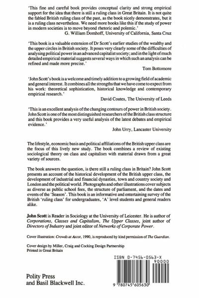 The lifestyle, economic basis and political affiliations of the British upper class are the focus of this exciting new textbook. Combining a review of existing sociological theory on class and capitalism with material drawn from a great variety of sources it is likely to become a standard course text. Examining the question of whether there is still a ruling class in Britain, John Scott presents an account of the historical development of the British upper class, the development of industrial and financial dynasties, town and country society as well as of London and the political world. Photographs and other illustrations cover subjects as diverse as public school fees, the structure of parliament, and the dates and events of the 'Season'.