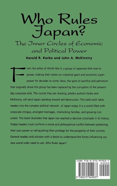 Fifty years ago, a new alliance of Japanese elites sparked the miraculous transformation of their country from a land decimated by war to an economic superpower that would become the envy of the world. These elites represented the best and brightest of Japan and they were willing to make great sacrifices for the prosperity of their people. Now, this same elitist system may be the nation's downfall. The new elites who replaced the pre-World War II zaibatsu elite have formed their own brand of upper class rule based on corporate control and domination of the state. Intent on solidifying their power through arranged marriages and interlocking families, many Japanese believe the new elite has become corrupt and self-serving. The resulting inequality has spurred growing anger among the non-elite classes. At a time when stability defines the new world order, Japan faces its greatest threat-the threat from within. Bound to be controversial, Who Rules Japan? is a study that expertly connects the country's economic, cultural, historical, and political facets. Kerbo and McKinstry explain how this new type of upper class has gradually spurned the traditional ideals of democracy in favor of an elitist approach that exploits the masses and causes ominous unrest. As a result, Japan is now confronted with a critical turning point in its history. The elites must choose between consolidating their personal power by continuing to resist change or beginning to make necessary sacrifices for their nation at the expense of their own privilege and prestige. The course they take will determine Japan's fate and the shape of the world order into the next century. Unique in its approach, this book will be of interest to scholars, researchers, students, and the general reader-all those interested in understanding Japan's inner struggle.