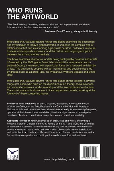 Who Runs the Artworld: Money, Power and Ethics examines, using transdisciplinary strategies, the economics and mythologies of today's global artworld. It unmasks the complex web of relationships that now exist between, high profile curators, collectors, museum trustees and corporate sponsors, and the historic and ongoing complicity between the art and money markets. It also examines alternative models being deployed by curators and artists influenced by the 2008 global financial crisis and the international socio-political Occupy movement. With a particular focus on a renewed activism by artists, coupled with an institutional and social critique led by groups such as Liberate Tate, the Precarious Workers Brigade and Strike Debt. Who Runs the Artworld: Money, Power and Ethics is one of the first books that brings together a diverse range of thinkers.