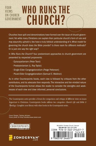 Churches have split and denominations have formed over the issue of church government. Yet while many Christians can explain their particular church's form of rule and may staunchly uphold it, few have a truly biblical understanding of it. What model for governing the church does the Bible provide? Is there room for different methods? Or is just one way the right way? In Who Runs the Church? Four predominant approaches to church government are presented by respected proponents: * Episcopalianism (Peter Toon) * Presbyterianism (L. Roy Taylor) * Single-Elder Congregationalism (Paige Patterson) * Plural-Elder Congregationalism (Samuel E. Waldron). As in other Counterpoints books, each view is followed by critiques from the other contributors, and its advocate then responds. The interactive and fair-minded nature of the Counterpoints format allows the reader to consider the strengths and weaknesses of each view and draw informed, personal conclusions.