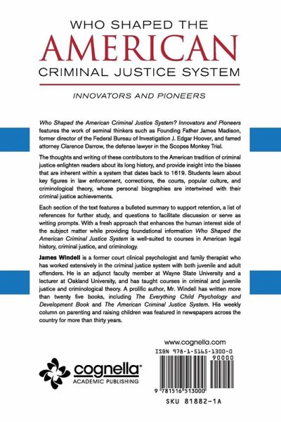 Who Shaped the American Criminal Justice System? Innovators and Pioneers features the work of seminal thinkers such as Founding Father James Madison, former director of the Federal Bureau of Investigation J. Edgar Hoover, and famed attorney Clarence Darrow, the defense lawyer in the Scopes Monkey Trial. The thoughts and writing of these contributors to the American tradition of criminal justice enlighten readers about its long history, and provide insight into the biases that are inherent within a system that dates back to 1619. Students learn about key figures in law enforcement, corrections, the courts, popular culture, and criminological theory, whose personal biographies are intertwined with their criminal justice achievements. Each section of the text features a bulleted summary to support retention, a list of references for further study, and questions to facilitate discussion or serve as writing prompts. With a fresh approach that enhances the human interest side of the subject matter while providing foundational information Who Shaped the American Criminal Justice System is well-suited to courses in American legal history, criminal justice, and criminology. James Windell is a former court clinical psychologist and family therapist who has worked extensively in the criminal justice system with both juvenile and adult offenders. He is an adjunct faculty member at Wayne State University and a lecturer at Oakland University, and has taught courses in criminal and juvenile justice and criminological theory. A prolific author, Mr. Windell has written more than twenty five books, including The Everything Child Psychology and Development Book and The American Criminal Justice System. His weekly column on parenting and raising children was featured in newspapers across the country for more than thirty years.
