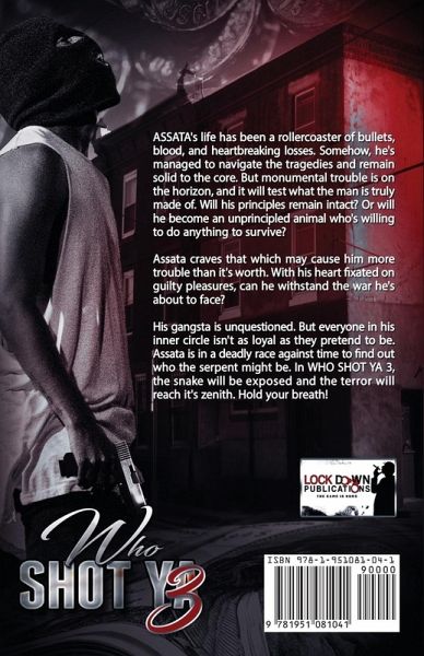 ASSATA's life has been a rollercoaster of bullets, blood, and heartbreaking losses. Somehow, he's managed to navigate the tragedies and remain solid to the core. But monumental trouble is on the horizon, and it will test what the man is truly made of. Will his principles remain intact? Or will he become an unprincipled animal who's willing to do anything to survive? Assata craves that which may cause him more trouble than it's worth. With his heart fixated on guilty pleasures, can he withstand the war he's about to face? His gangsta is unquestioned. But everyone in his inner circle isn't as loyal as they pretend to be. Assata is in a deadly race against time to find out who the serpent might be. In WHO SHOT YA 3, the snake will be exposed and the terror will reach it's zenith. Hold your breath!