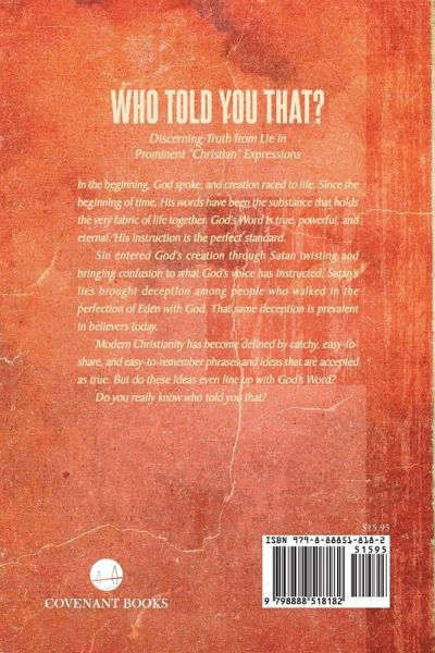 In the beginning, God spoke, and creation raced to life. Since the beginning of time, His words have been the substance that holds the very fabric of life together. God's Word is true, powerful, and eternal. His instruction is the perfect standard. Sin entered God's creation through Satan twisting and bringing confusion to what God's voice has instructed. Satan's lies brought deception among people who walked in the perfection of Eden with God. That same deception is prevalent in believers today. Modern Christianity has become defined by catchy, easy-to-share, and easy-to-remember phrases and ideas that are accepted as true. But do these ideas even line up with God's Word? Do you really know who told you that?
