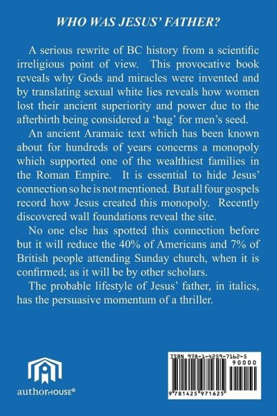 WHO WAS JESUS' FATHER? A serious rewrite of BC history from a scientific irreligious point of view. This provocative book reveals why Gods and miracles were invented and by translating sexual white lies reveals how women lost their ancient superiority and power, due to the afterbirth being considered a 'bag' for men's seed. An ancient Aramaic text which has been known about for hundreds of years concerns a monopoly which supported one of the wealthiest families in the Roman Empire. It is essential to hide Jesus' connection so he is not mentioned. But all four gospels record how Jesus created this monopoly. Recently discovered wall foundations reveal the site. No one else has spotted this connection before but it will reduce the 40% of Americans and 7% of British people attending Sunday church, when it is confirmed; as it will be by other scholars. The probable lifestyle of Jesus' father, in italics, has the persuasive momentum of a thriller.