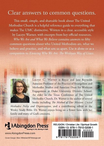 Clear answers to common questions. This small, simple, and shareable book about The United Methodist Church is a helpful reference guide to everything that makes The UMC distinctive. Written in a clear, accessible style by Laceye Warner, Who We Are and What We Believe: 50 Questions about the UMC contains answers to fifty common questions about who United Methodists are, what we believe and practice, and what sets us apart. Use it alone or as a companion to Knowing Who We Are: The Wesleyan Way of Grace .