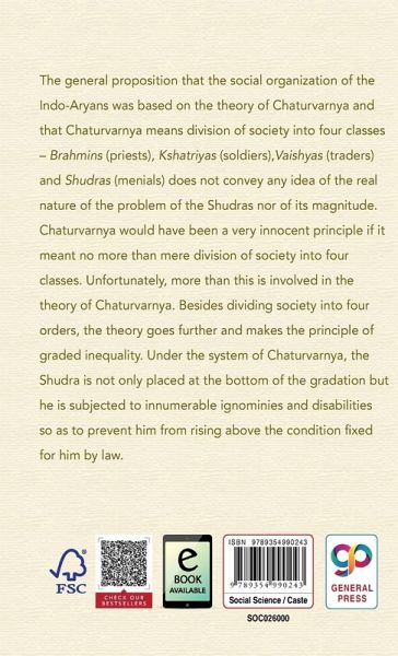 The general proposition that the social organization of the Indo-Aryans was based on the theory of Chaturvarnya and that Chaturvarnya means division of society into four classes-Brahmins (priests), Kshatriyas (soldiers),Vaishyas (traders) and Shudras (menials) does not convey any idea of the real nature of the problem of the Shudras nor of its magnitude. Chaturvarnya would have been a very innocent principle if it meant no more than mere division of society into four classes. Unfortunately, more than this is involved in the theory of Chaturvarnya. Besides dividing society into four orders, the theory goes further and makes the principle of graded inequality. Under the system of Chaturvarnya, the Shudra is not only placed at the bottom of the gradation but he is subjected to innumerable ignominies and disabilities so as to prevent him from rising above the condition fixed for him by law. Indeed until the fifth Varna of the Untouchables came into being, the Shudras were in the eyes of the Hindus the lowest of the low. This shows the nature of what might be called the problem of the Shudras. If people have no idea of the magnitude of the problem it is because they have not cared to know what the population of the Shudras is.