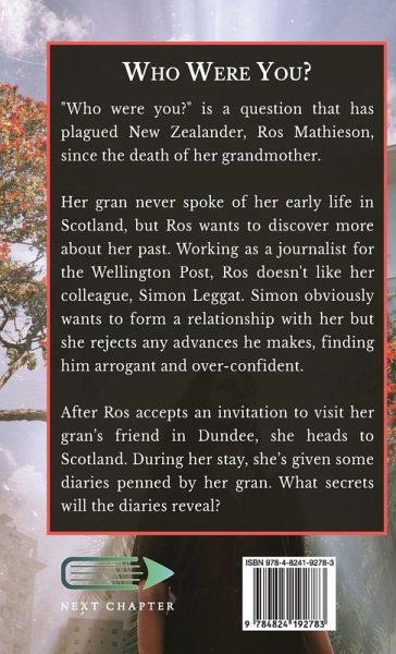 "Who were you?" is a question that has plagued New Zealander, Ros Mathieson, since the death of her grandmother. Her gran never spoke of her early life in Scotland, but Ros wants to discover more about her past. Working as a journalist for the Wellington Post, Ros doesn't like her colleague, Simon Leggat. Simon obviously wants to form a relationship with her but she rejects any advances he makes, finding him arrogant and over-confident. After Ros accepts an invitation to visit her gran's friend in Dundee, she heads to Scotland. During her stay, she's given some diaries penned by her gran. What secrets will the diaries reveal?