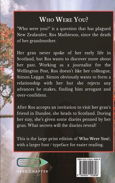 "Who were you?" is a question that has plagued New Zealander, Ros Mathieson, since the death of her grandmother. Her gran never spoke of her early life in Scotland, but Ros wants to discover more about her past. Working as a journalist for the Wellington Post, Ros doesn't like her colleague, Simon Leggat. Simon obviously wants to form a relationship with her but she rejects any advances he makes, finding him arrogant and over-confident. After Ros accepts an invitation to visit her gran's friend in Dundee, she heads to Scotland. During her stay, she's given some diaries penned by her gran. What secrets will the diaries reveal? This is the large print edition of Who Were You?, with a larger font / typeface for easier reading.