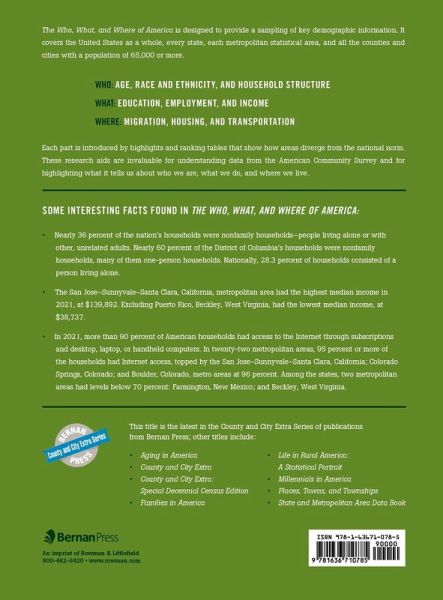 The Who, What, and Where of America: Understanding the American Community Survey pulls details from the American Community Survey (ACS) which provides a portrait of America at a certain point in time. This book covers each U.S. state, county, metropolitan area, and city with a population of 20,000 or more.