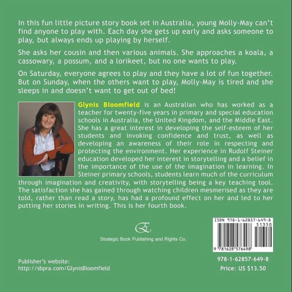In this fun little picture story book set in Australia, young Molly-May can't find anyone to play with. Each day she gets up early and asks someone to play, but always ends up playing by herself. She asks her cousin and then various animals. She approaches a koala, a cassowary, a possum, and a lorikeet, but no one wants to play. On Saturday, everyone agrees to play and they have a lot of fun together. But on Sunday, when the others want to play, Molly-May is tired and she sleeps in and doesn't want to get out of bed! Glynis Bloomfield is an Australian who has worked as a teacher for twenty-five years in primary and special education schools in Australia, the United Kingdom, and the Middle East. She has a great interest in developing the self-esteem of her students and invoking confidence and trust, as well as developing an awareness of their role in respecting and protecting the environment. Her experience in Rudolf Steiner education developed her interest in storytelling and a belief in the importance of the use of the imagination in learning. In Steiner primary schools, students learn much of the curriculum through imagination and creativity, with storytelling being a key teaching tool. The satisfaction she has gained through watching children mesmerised as they are told, rather than read a story, has had a profound effect on her and led to her putting her stories in writing. This is her fourth book. Publisher's website: http://sbpra.com/GlynisBloomfield