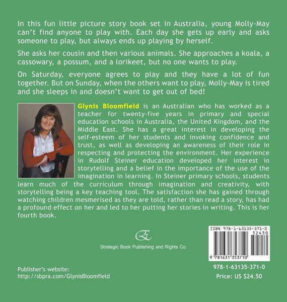 In this fun little picture story book set in Australia, young Molly-May can't find anyone to play with. Each day she gets up early and asks someone to play, but always ends up playing by herself. She asks her cousin and then various animals. She approaches a koala, a cassowary, a possum, and a lorikeet, but no one wants to play. On Saturday, everyone agrees to play and they have a lot of fun together. But on Sunday, when the others want to play, Molly-May is tired and she sleeps in and doesn't want to get out of bed! Glynis Bloomfield is an Australian who has worked as a teacher for twenty-five years in primary and special education schools in Australia, the United Kingdom, and the Middle East. She has a great interest in developing the self-esteem of her students and invoking confidence and trust, as well as developing an awareness of their role in respecting and protecting the environment. Her experience in Rudolf Steiner education developed her interest in storytelling and a belief in the importance of the use of the imagination in learning. In Steiner primary schools, students learn much of the curriculum through imagination and creativity, with storytelling being a key teaching tool. The satisfaction she has gained through watching children mesmerised as they are told, rather than read a story, has had a profound effect on her and led to her putting her stories in writing. This is her fourth book. Publisher's website: http://sbpra.com/GlynisBloomfield