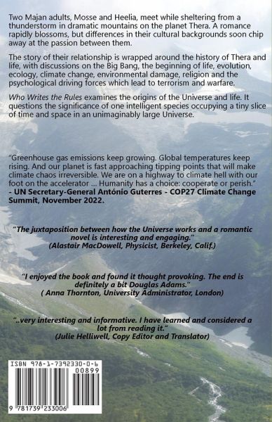 A whirlwind, holiday romance in dramatic mountain scenery rapidly blossoms, then falters due to cultural differences of the protagonists. The story of the relationship of Mosse and Heelia on the planet Thera is wrapped around the history of Thera and life. The text includes discussions of the Big Bang, evolution, ecology, climate change, environmental damage, religion and the psychological driving forces which lead to terrorism and warfare. Who Writes the Rules examines the origins of the Universe and life. It questions the significance of one intelligent species occupying a tiny slice of time and space in an unimaginably large Universe. At a time when humanity is destroying the environment for all life on Earth, and threats of nuclear war seem to be creeping over the horizon, the novel is written to provide food for thought about the underlying factors which drive people to behave in a destructive and negative manner without any consideration for the future impact of this.