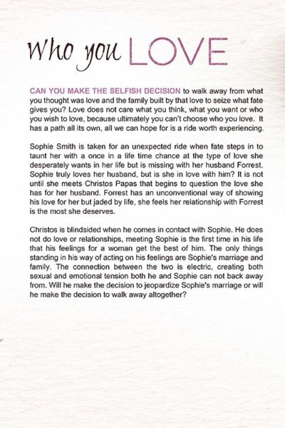 Love does not care what you think, what you want or who you wish to love, because ultimately you can't choose who you love. It has a path all its own, all we can hope for is a ride worth experiencing. Sophie Smith is taken for an unexpected ride when fate steps in to taunt her with a once in a life time chance at the type of love she desperately wants in her life but is missing with her husband Forrest. Sophie truly loves her husband, but is she in love with him? It isn't until she meets Christos Papas that begins to question the love she has for her husband. Forrest has an unconventional way of showing his love for her but jaded by life, she feels her relationship with Forrest is the most she deserves. Christos is blindsided when he comes in contact with Sophie. He doesn't do love or relationships, meeting Sophie is the first time in his life that his feelings for a woman get the best of him. The only things standing in his way of acting on his feelings are Sophie's marriage and family.