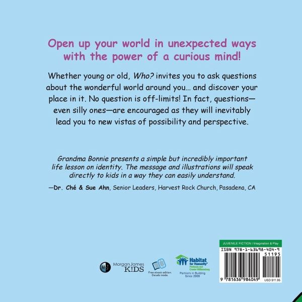 Who? is the first in a series of five books (Who?, What?, When?, Where?, and Why?) focused on preschool and early elementary-aged children and the questions they ask. Its rhythmic, melodic prose and smile-inducing illustrations delight young and old alike while encouraging the quest for knowledge. Posing fun and sometimes silly questions to the naturally curious young mind stimulates the intellect and opens whole new realms for exploration, critical thinking, and creative problem-solving. Who? teaches that learning is an adventure as we actively engage with a world just waiting to reveal its secrets and our special place in it.