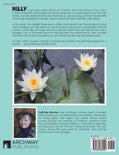 Nilly is an insect baby, known as a nymph. She is tiny without much color. A storm transports Nilly through the air and drops her in a small creek away from her family. She lives beneath the water, feels like an ugly ducking, and has the appetite of a hungry caterpillar. She eats, hides, eats some more, watches, and wishes. In the water, she realizes there are no other creatures like her. Everything is moving and changing, but Nilly seems to stay the same. She wants to be graceful like the snakes, colorful like the frogs, and have gills and teeth that work like the fish. She is amazed, too, at the birds and how they rise from the water and fly. Nilly wonders what she will be when she grows up, and hopes the growing up happens soon. For Nilly, a time of great change is coming. She will learn that all things happen for a reason ... and at exactly the right time.
