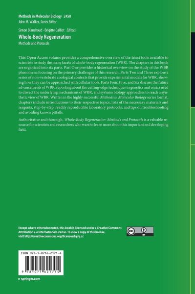 This Open Access volume provides a comprehensive overview of the latest tools available to scientists to study the many facets of whole-body regeneration (WBR). The chapters in this book are organized into six parts. Part One provides a historical overview on the study of the WBR phenomena focusing on the primary challenges of this research. Parts Two and Three explore a series of non-vertebrate zoological contexts that provide experimental models for WBR, showing how they can be approached with cellular tools. Parts Four, Five, and Six discuss the future advancements of WBR, reporting about the cutting-edge techniques in genetics and omics used to dissect the underlying mechanisms of WBR, and systems biology approaches to reach a synthetic view of WBR. Written in the highly successful Methods in Molecular Biology series format, chapters include introductions to their respective topics, lists of the necessary materials and reagents, step-by-step, readily reproducible laboratory protocols, and tips on troubleshooting and avoiding known pitfalls.