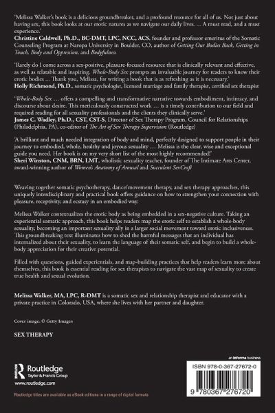 'Whole-Body Sex: Somatic Sex Therapy and the Lost Language of the Erotic Body by Melissa Walker offers a compelling and transformative narrative towards embodiment, intimacy, and discourse about desire. This meticulously constructed work gives us an enhanced set of tools and language that centers somatic sex therapy and the necessity of considering the nuances of clients' sexual selves. This book is a timely contribution to our field and required reading for all sexuality professionals and the clients they clinically serve.'- James C. Wadley, Ph.D., CST, CST-S, Director of Sex Therapy Program, Council for Relationships (Philadelphia, PA), co-editor of The Art of Sex Therapy Supervision (Routledge)