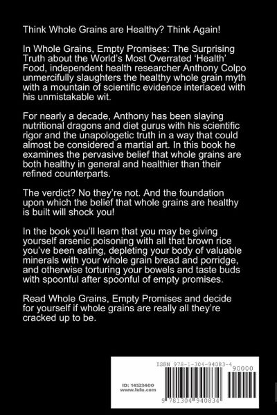 Think Whole Grains are Healthy? Think Again! Independent researcher Anthony Colpo unmercifully slaughters the healthy whole grain myth with a mountain of scientific evidence interlaced with his unmistakable wit. For nearly a decade, Anthony has been slaying nutritional dragons and diet gurus with his scientific rigor and the unapologetic truth in a way that could almost be considered a martial art. In this book he examines the pervasive belief whole grains are both healthy in general and superior to their refined counterparts. The verdict? No they're not. And the foundation upon which the belief that whole grains are healthy is built will shock you! You'll learn why you may be giving yourself arsenic poisoning by eating brown rice, depleting your body of valuable minerals with whole grain breads, and otherwise torturing your bowels and taste buds with spoonful after spoonful of empty promises. Read Whole Grains, Empty Promises and learn why whole grains are not all they're cracked up to be.