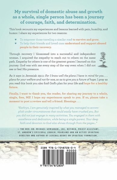 My survival of domestic abuse and growth into a whole, single person has been a journey of courage, faith, and determination. This book recounts my experiences and lessons learned with all their pain, humility, and humor. I share my experiences for two reasons: * To empower those traveling a similar road to survive and grow. * To help their friends and loved ones understand and support the abused person in their recovery. Through recovery I blossomed into a successful, independent woman and gained the empathy to reach out to others. God was with me every step of the way even when I did not see or feel His Presence. As it says in Jeremiah 29:11: For I know well the plans I have in mind for you . . . plans for your welfare and not for woe, so as to give you a future of hope. I pray as you read this book that you also find God's plan for your life. Finally, I want to thank you, the reader, for sharing my journey. I hope my experiences speak to you. If so, please take a moment to post a review and tell a friend.