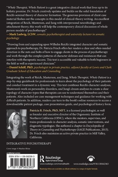 Integrating the work of Reich, Masterson, and Jung, Whole Therapist, Whole Patient is a step-by-step guidebook for professionals to learn about the psychology of their patients and conduct treatment in a dynamic way. This text combines Reich's character analyses, Masterson's work on personality disorders, and Jung's dream analyses to create a clear typology of character types that therapists can use to understand themselves and their patients. Also included are case management techniques and guidance for working with difficult patients. In addition, readers can turn to the book's online resources to access a downloadable patient package, case presentation guide, and psychological history form.