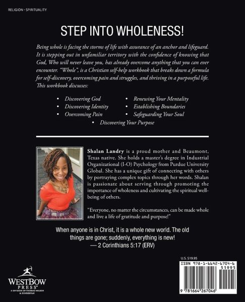 STEP INTO WHOLENESS! Being whole is facing the storms of life with assurance of an anchor and lifeguard. It is stepping out in unfamiliar territory with the confidence of knowing that God, Who will never leave you, has already overcome anything that you can ever encounter. "Whole", is a Christian self-help workbook that breaks down a formula for self-discovery, overcoming pain and struggles, and thriving in a purposeful life. This workbook discusses: ¿ Discovering God ¿ Discovering Identity ¿ Overcoming Pain ¿ Renewing Your Mentality ¿ Establishing Boundaries ¿ Safeguarding Your Soul ¿ Discovering Your Purpose When anyone is in Christ, it is a whole new world. The old things are gone; suddenly, everything is new! - 2 Corinthians 5:17 (ERV)