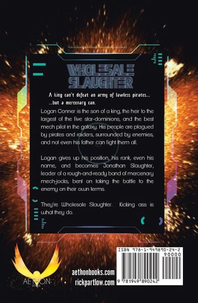 A king can't defeat an army of lawless pirates... ...but a mercenary can. Logan Conner is the son of a king, the heir to the largest of the five star-dominions, and the best mech pilot in the galaxy. His people are plagued by pirates and raiders, surrounded by enemies, and not even his father can fight them all. Logan gives up his position, his rank, even his name, and becomes Jonathan Slaughter, leader of a rough-and-ready band of mercenary mech-jocks, bent on taking the battle to the enemy on their own terms. They’re Wholesale Slaughter. Kicking ass is what they do. Get book one in this thrilling and unpredictable Military Sci-Fi Adventure Today! Also available on Audible, narrated by the award-winning Marc Vietor.