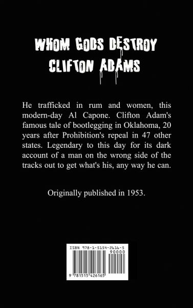 He trafficked in rum and women, this modern-day Al Capone. Clifton Adam's famous tale of bootlegging in Oklahoma, 20 years after Prohibition's repeal in 47 other states. Legendary to this day for its dark account of a man on the wrong side of the tracks out to get what's his, any way he can. Originally published in 1953.