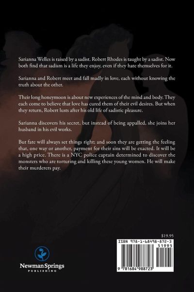 Sarianna Welles is raised by a sadist. Robert Rhodes is taught by a sadist. Now both find that sadism is a life they enjoy, even if they hate themselves for it. Sarianna and Robert meet and fall madly in love, each without knowing the truth about the other. Their long honeymoon is about new experiences of the mind and body. They each come to believe that love has cured them of their evil desires. But when they return, Robert lusts after his old life of sadistic pleasure. Sarianna discovers his secret, but instead of being appalled, she joins her husband in his evil works. But fate will always set things right; and soon they are getting the feeling that, one way or another, payment for their sins will be exacted. It will be a high price. There is a NYC police captain determined to discover the monsters who are torturing and killing these young women. He will make their murderers pay.