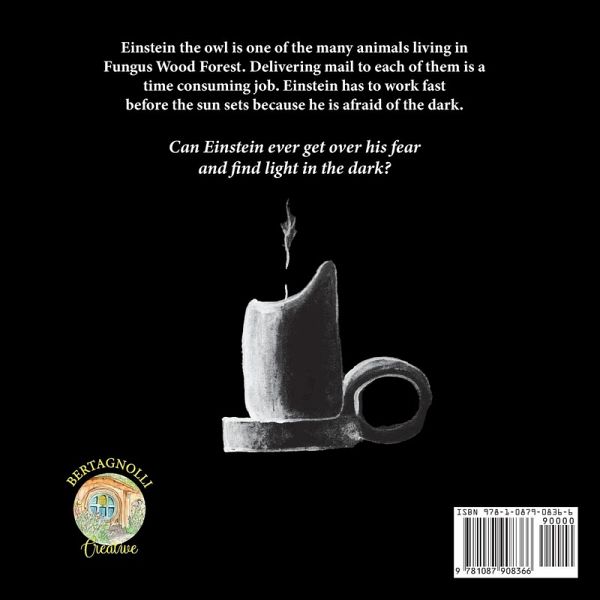 Einstein the owl is one of the many animals living in Fungus Wood Forest. Delivering mail to each of them is a time consuming job. Too bad Einstein can't work fast enough before the sun sets because he is afraid of the dark. He must get over his fear of the dark when he oversleeps and runs out of daylight before he makes each delivery. Can Einstein ever get over his fear of the dark?