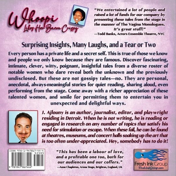 Surprising Insights, Many Laughs, and a Tear or Two Every person has a private life and a secret self. This is true of those we know and people we only know because they are famous. Discover fascinating, intimate, clever, witty, poignant, insightful tales from a diverse roster of notable women who dare reveal both the unknown and the previously undisclosed. But these are not gossipy tales-no. They are personal, anecdotal, always-meaningful stories for quiet reading, sharing aloud, even performing from the stage. Illustrated with whimsical portraits that capture these remarkable celebrities at their best,Whoopi Likes Her Bacon Crispy is offered in laminate hardcover, soft, and digital editions. Come away with a richer appreciation of these talented women, and smile for permitting them to entertain you in unexpected and delightful ways.