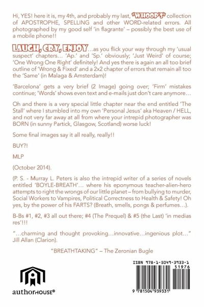 Hi, YES! here it is, my 4th, and probably my last, "WHOOP'S" collection of APOSTROPHE, SPELLING and other WORD-related errors. All photographed by my good self 'in flagrante' - possibly the best use of a mobile phone!! LAUGH, CRY, ENJOY...as you flick your way through my 'usual suspect' chapters... 'Ap.' and 'Sp.' obviously; 'Just Weird' of course; 'One Wrong One Right' definitely! And yes there is again an all too brief outline of 'Wrong & Fixed' and a 2x2 chapter of errors that remain all too the 'Same' (in Malaga & Amsterdam)! 'Barcelona' gets a very brief (2 Image) going over; 'Firm' mistakes continue; 'Words' shows even text and e-mails just don't care anymore... Oh and there is a very special little chapter near the end entitled 'The Stall' where I stumbled into my own 'Personal Jesus' aka Heaven / HELL, and not very far away at all from where your intrepid photographer was BORN (in sunny Partick, Glasgow, Scotland) worse luck! Some final images say it all really, really!! BUY?! MLP (October 2014).