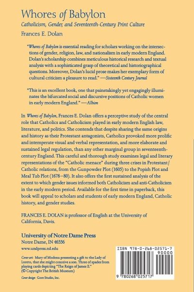 In Whores of Babylon, Frances E. Dolan offers a perceptive study of the central role that Catholics and Catholicism played in early modern English law, literature, and politics. She contends that despite sharing the same blood, origins, and history as their Protestant antagonists, Catholics provoked more prolific and intemperate visual and verbal representation, and more elaborate and sustained legal regulation, than any other marginal group in seventeenth-century England. This careful and thorough study examines legal and literary representations of the "Catholic menace" during three crises in Protestant/Catholic relations, from the Gunpowder Plot (1605) to the Popish Plot and Meal Tub Plot (1678-80). It also offers the first sustained analysis of the extent to which gender issues informed both Catholicism and anti-Catholicism in the early modern period. Available for the first time in paperback, this book will appeal to scholars and students of early modern England, Catholic history, and gender studies.