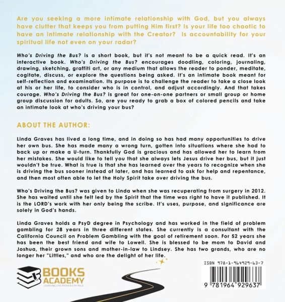 Are you seeking a more intimate relationship with God, but you always have clutter that keeps you from putting Him first? Is your life too chaotic to have an intimate relationship with the Creator? Is accountability for your spiritual life not even on your radar? Who's Driving the Bus? is a short book, but it's not meant to be a quick read. It's an interactive book. Who's Driving the Bus? encourages doodling, coloring, journaling, drawing, sketching, graffiti art, or any medium that allows the reader to ponder, meditate, cogitate, discuss, or explore the questions being asked. It's an intimate book meant for self-reflection and examination. Its purpose is to challenge the reader to take a close look at his or her life, to consider who is in control, and adjust accordingly. And that takes courage. Who's Driving the Bus? is great for one-on-one partners or small group or home group discussions for adults. So, are you ready to grab a box of colored pencils and take an intimate look at who's driving your bus?