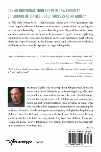 Can an individual turn the pain of a troubled childhood into a recipe for success as an adult? In Who's in the Waiting Room?, Neal Goldstein tells his own story of going from high school dropout to lawyer, a dramatic transformation that he achieved by tapping into the power of relationships. Alongside his journey of self-discovery, Neal presents five behaviors anyone can adopt to foster quality relationships: find your people, acknowledge the need for each other, listen more than you talk, recognize the value of face-to-face contact, and find common ground. He explains how the pain of his youth became his power and offers actionable success moves to help anyone recognize how strengthening relationships in their own lives can lead to success and satisfaction.