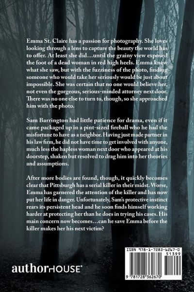 Emma St. Claire has a passion for photography. She loves looking through a lens to capture the beauty the world has to offer. At least she did...until the grainy view exposed the foot of a dead woman in red high heels. Emma knew what she saw, but with the fuzziness of the photo, finding someone who would take her seriously would be just about impossible. She was certain that no one would believe her, not even the gorgeous, serious-minded attorney next door. There was no one else to turn to, though, so she approached him with the photo. Sam Barrington had little patience for drama, even if it came packaged up in a pint-sized fireball who he had the misfortune to have as a neighbor. Having just made partner in his law firm, he did not have time to get involved with anyone, much less the hapless woman next door who appeared at his doorstep, shaken but resolved to drag him into her theories and assumptions. After more bodies are found, though, it quickly becomes clear that Pittsburgh has a serial killer in their midst. Worse, Emma has garnered the attention of the killer and has now put her life in danger. Unfortunately, Sam's protective instinct rears its persistent head and he soon finds himself working harder at protecting her than he does in trying his cases. His main concern now becomes...can he save Emma before the killer makes her his next victim?