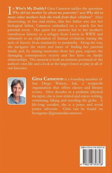 In Who's My Daddy? Gina Cameron tackles the questions Why did my mother lie about my paternity? and Why did so many other mothers hide the truth from their children? After discovering, in her mid-sixties, that her father was not her biological father, Cameron embarked on a search for her paternal roots. Her quest for answers led to her mother's tumultuous history as a refugee from Latvia in WWII and ultimately to an exploration of human evolution, tracing the arch of history from matriarchy to patriarchy. Along the way, she navigates the twists and turns of finding her paternal family and, by mining memories from her past, exposes the damaging consequences secrets and lies have on family relationships. The memoir is both an intimate portrayal of the author's own life and a look at the larger forces at play in all of our histories.