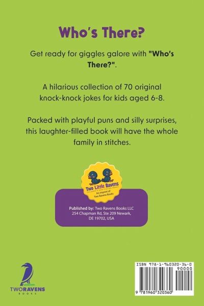 Embark on a hilarious journey with "Who's There?": a captivating collection of 70 creative jokes for kids aged 6-8! This book teems with entertaining wordplay for kids and witty surprises guaranteed to induce laughter and stimulate language development through jokes. Delve into various engaging and age-appropriate wordplay jokes for kids that ensure shared laughter and amusement within the family. These ingeniously constructed jokes are not merely sources of entertainment but also catalysts for children's creativity and linguistic skills enhancement. Get a glimpse of the side-splitting humor that awaits: Knock, knock. Who's there? Olive. Olive who? Olive you and I miss you! Knock, knock. Who's there? Harry. Harry who? Harry up and answer the door! Knock, knock. Who's there? Bee. Bee who? Bee kind and laugh at my joke! Every joke is crafted to trigger chuckles and generate memorable moments of joy between children and their families. Whether you're having a cozy family night in, embarking on a road trip, or enjoying a get-together with friends, these jokes are the perfect recipe for happy faces. "Who's There?" is more than just a book; it's an ideal gift that can be shared by grandparents, parents, and caregivers with their cherished little ones. It paves the way for family bonding through humor, fostering treasured memories painted with the vibrant colors of laughter. Don't miss out on this laughter-filled journey! Order your copy of "Who's There?: 70 Original Knock Knock Jokes For Kids Ages 6-8" now and experience the euphoria of laughter with your children. Brace yourself for an outpouring of giggles, valuable family time, and much fun! Order Your Copy Now and embark on a voyage of language development through jokes and humor with your little ones today!