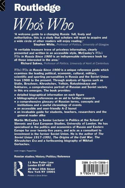 Who's Who is Russia and the Soviet Union is a unique reference guide on the leading political, economic, cultural, military, scientific and sporting personalities from 1900-1991. Including biographical information, a glossary, a chronology of events and an A-Z layout, it is invaluable for students, teachers, researchers and general readers.