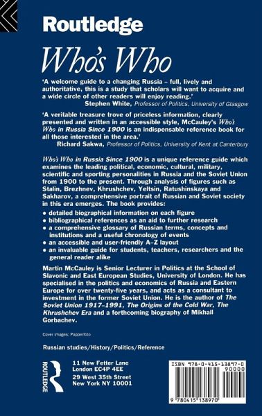 Who's Who is Russia and the Soviet Union is a unique reference guide which examines the leading political, economic, cultural, military, scientific and sporting personalities from 1900-1991. Through analysis of figures such as Stalin, Brezhnev, Khrushchev, Yeltsin, Ratushinskaya and Sakharov, a comprehensive portrait of Russian and Soviet society in this era emerges. The book takes the reader up to the collapse of the Soviet Union and provides: - detailed biographical information on each leading figure - bibliographical references with entries as an aid to further research - a comprehensive glossary of Russian terms, concepts and institutions and a useful chronology of events - an accessible and user-friendly A-Z layout - an invaluable guide for students, teachers, researchers, and the general reader alike.