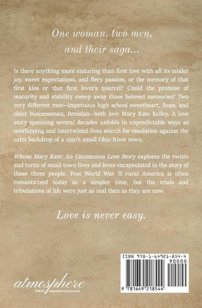 One Woman, Two Men and their saga. Is there anything more enduring than first love with all its tender joy, sweet expectations, and fiery passion, or the memory of that first kiss or that first lover's quarrel? Could the promise of maturity and stability sweep away those beloved memories? Two very different men-impetuous high school sweetheart, Sean, and older businessman, Brendan-both love Mary Kate Kelley. A love story spanning several decades unfolds in unpredictable ways as overlapping and intertwined lives search for resolution against the calm backdrop of a 1950's small Ohio River town. Whose Mary Kate: An Uncommon Love Story explores the twists and turns of small town lives and loves encapsulated in the story of these three people. Post World War II rural America is often romanticized today as a simpler time, but the trials and tribulations of life were just as real then as they are now. Love is never easy.
