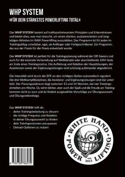 Das WHP SYSTEM basiert auf kraftsportrelevanten Prinzipien und Erkenntnissen und bietet alles, was man braucht, um einen starken, ausbalancierten und langlebigen Athleten im RAW Powerlifting auszubilden. Das Programm ist für jeden im Trainingsalltag umsetzbar, egal, ob Anfänger oder Fortgeschrittener. Ein Programm, das aus der Praxis für die Praxis entwickelt wurde.Das WHP SYSTEM ist perfekt für die Trainingsplanung während der Off-Season und auch für die konkrete Vorbereitung auf Wettkämpfe oder abschließende 1RM-Tests am Ende eines Trainingszyklus. Die Aufteilung und Rotation der Hauptübungen, der Assistenzen sowie der Ergänzungsübungen sind schlüssig aufeinander abgestimmt. Die Intensität wird durch die RPE an den richtigen Stellen automatisch reguliert. Die drei Wettkampfdisziplinen, die Assistenz- und Ergänzungsübungen sind klar unterteilt. Der Planungszeitraum liegt zwischen 13 und 14 Wochen, bei vier Trainingseinheiten pro Woche. Du wirst stärker, aber auch der Spaß und die Freude am Training kommen nicht zu kurz und du findest ausgewählte Vorschläge zur Übungsauswahl und Übungsreihenfolge.Das WHP SYSTEM hilft dir, deine Trainingsbelastung zu steuern, die richtige Frequenz und Rotation in deiner Übungsauswahl zu finden, dein Trainingsvolumen anzupassen und Deload-Optionen zu nutzen.