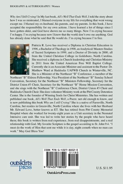 Patricia R. Love has received a Diploma in Christian Education in 1996, a Bachelor of Theology in 1998, an Analytical/ Masters Studies of Sacred Scriptures in 1999, and a Doctor of Divinity in 2000, all from the United Christian College in Goldsboro, North Carolina. She received a diploma in Church leadership and Christian Ministry in 2011 from the United American Free Will Baptist College. Currently she is an Associate Minister and assistant to the Pastor: Dr. Matthew Ward at Haddocks UAFWB Church in Winterville, NC. She is a Minister of the Northeast "B" Conference, a member of the Northeast "B" Eldress Fellowship, Vice President of the Northeast "B" Sunday School Convention, Secretary for the Northeast "B" Ministers Fellowship, Secretary for the District Union #3 Choir, Secretary for the Northeast "B" Home Mission Convention, and she sings with the Northeast "B" Conference Choir, District Union #3 Choir and Haddocks Church Choir. She does volunteer Ministry work at the Pitt County Detention Center. She is the founder of Winning Souls for Christ Ministries. She has written and published one book, All's Well That Ends Well, a Poem: not old enough to know, and is now publishing this book Why am I still Crying? She is a native of Farmville, North Carolina, but resides in Greenville, North Carolina where she lives with her Husband Mr. Edward Love, better known as ET. She has retired from Pitt County Memorial Hospital where she worked for twenty-eight years as a Unit secretary in the Neonatal Intensive care unit. She was led to write her stories by the people who have heard them; this book is written from real experience, from real disappointments, and a real relationship with God. My favorite Scripture is the gospel according to St. John 9:4. "I must do the work of Him that sent me while it is day, night cometh when no man can work." May God Bless You!
