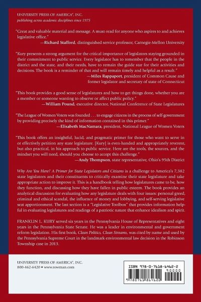 Why Are You Here? A Primer for State Legislators and Citizens is a challenge to America’s 7,382 state legislators and their constituents to critically examine their state legislature and take appropriate action to improve it.