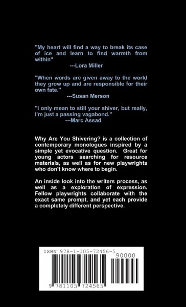 Why Are You Shivering? is a collection of contemporary monologues inspired by a simple yet evocative question. Great for young actors searching for resource materials, as well as for new playwrights who don't know where to begin. An inside look into the writers process, as well as a exploration of expression. Fellow playwrights collaborate with the exact same prompt, and yet each provide a completely different perspective. "My heart will find a way to break its case of ice and learn to find warmth from within" ---Lora Miller "When words are given away to the world they grow up and are responsible for their own fate." ---Susan Merson "I only mean to still your shiver, but really, I'm just a passing vagabond." ---Marc Assad