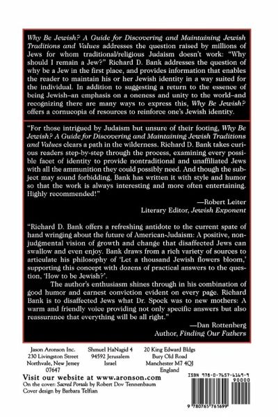 Why Be Jewish? A Guide for Discovering and Maintaining Jewish Traditions and Values addresses the question raised by millions of Jews for whom traditional/religious Judaism doesn't work: "Why should I remain a Jew?" Richard D. Bank addresses the question of why be a Jew in the first place, and provides information that enables the reader to maintain his or her Jewish identity in a way suited for the individual. In addition to suggesting a return to the essence of being Jewish-an emphasis on a oneness and unity to the world-and recognizing there are many ways to express this, Why be Jewish? offers a cornucopia of resources to reinforce one's Jewish identity.