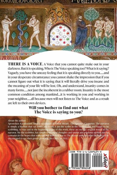 THERE IS A VOICE. A Voice that you cannot quite make out in your darkness. But it is speaking. Who is The Voice speaking too? What is it saying? Vaguely, you have the uneasy feeling that it is speaking directly to you......and in your desperate circumstance you cannot shake the impression that if you cannot figure out what it is saying that it will literally drive you insane and the meaning of your life will be lost. Oh, and understand, insanity comes in many forms......not just the incoherent in a rubber room. Insanity is the most common condition among mankind....it is working in you and working in your neighbor......all because men will not listen to The Voice and as a result are left to their own devices. Will you bother to find out what The Voice is saying to you? About the author: Apostolaos Karakockos; loosely translated in Greek means, The Apostles Carpenter. The narrator is simply a HisMan that sat down and wrote. I am the scribe in the background and happy to be scribbling. As was said in the beginning pages of this work, these are not the original words of the narrator. Me the scribbler, has simply rearranged thoughts and truths and wisdoms spoken out for centuries in the hopes that someone will find their way to The Master and that other HisMen will be encouraged to use their given talents for His Glory. Jer 30:1-2