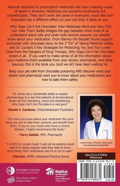 Adverse reactions to prescription medicines are now a leading cause of death in America. If you are one of the millions who take at least one prescription drug regularly, how can you stay safe? Though powerful treatments, medicines are unpredictable because they don't work the same in everyone, just as chocolate has a different effect on your pet than it does on you. Why Dogs Can’t Eat Chocolate: How Medicines Work and How YOU Can Take Them Safely bridges the gap between what doctors may assume you know about your medicines and what you actually understand about how to take them safely. Pharmacist and award-winning medical educator Louise Achey has been translating complex and confusing concepts about how medicine works for thirty-four years. From Barney the Bassett hound puppy’s encounter with chocolate to the three "Ds" of taking medicine safely, Dr. Louise explains in a clear and entertaining way what happens in our body when we take a medicine or supplement. She uses a common question (why is chocolate so dangerous for dogs?) to illustrate why side effects from medicines happen to some of us and not to others, and provides specific proven strategies to help you take your medicine and food supplements safely.