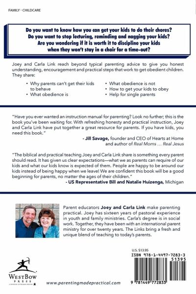 Do you want to know how you can get your kids to do their chores? Do you want to stop lecturing, reminding and nagging your kids? Are you wondering if it is worth it to discipline your kids when they won't stay in a chair for a time-out? Joey and Carla Link reach beyond typical parenting advice to give you honest understanding, encouragement and practical steps that work to get obedient children. They share: Why parents can't get their kids to behave What obedience is What obedience is not How to get your kids to obey Help for single parents "Have you ever wanted an instruction manual for parenting? Look no further; this is the book you've been waiting for. With refreshing honesty and practical instruction, Joey and Carla Link have put together a great resource for parents. If you have kids, you need this book." - Jill Savage, founder and CEO of Hearts at Home and author of Real Moms ... Real Jesus "The biblical and practical teaching Joey and Carla Link share is something every parent should read. It has given us clear expectations-what we as parents can require of our kids and what our kids know is expected of them. People are happy to be around our kids instead of being happy when we leave! We are confident this book will be a good beginning for parents, no matter the ages of their children." - US Representative Bill and Natalie Huizenga, Michigan