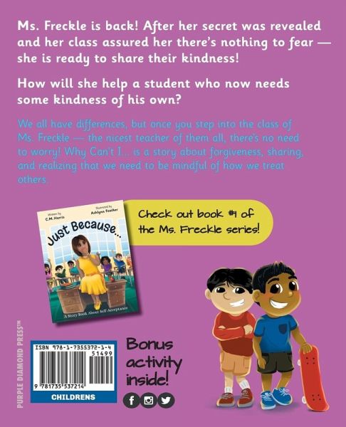 Ms. Freckle is back and ready to share her message of kindness! In the class of Ms. Freckle, the nicest teacher of them all, there's no room for judgment. When a student brings a toy to share with his classmates, he finds that not everyone is kind, but when Ms. Freckle steps in, she surprises them with a lesson that will change their minds about how we treat others. -------------- "In our classroom, we accept everyone and show kindness and care to each other. Kindness can be spread in many ways. When someone is hurt, we can offer help and when someone is alone, we can offer our company." Why Can't I... is a story about caring, sharing, and realizing that we must be mindful of how we treat others. Some friendships can evolve in unexpected ways, and this meaningful story will show readers how to be kind to one another and even forgive those who are not so kind. If you enjoyed the first heartwarming story in this series, Just Because... A story book about Self-acceptance. You'll love this book! Bonus activity inside and book #3 coming soon