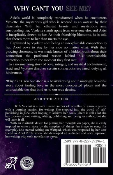 Axiel's world is completely transformed when he encounters Vyolette, the mysterious girl who is scorned as an outcast by their classmates. With her ethereal beauty and mysterious aura surrounding her, Vyolette stands apart from everyone else, and Axiel is inexplicably drawn to her. As their friendship blossoms, he is told that there's more to her than meets the eye. Captivated by Vyolette and feeling an unexplainable connection to her, Axiel vows to stay by her side no matter what. With their growing closeness, he was made known of a hidden truth about their connection-the profound reason behind his unexplainable attraction to her from the moment they first met. In a mesmerizing story of love, intrigue, and mystical enchantment, Axiel and Vyolette discover certain connections are fated, defying all hindrances. 'Why Can't You See Me?' is a heartwarming and hauntingly beautiful story about finding love in the most unexpected places and the unbreakable ties that bind us to our true destiny.
